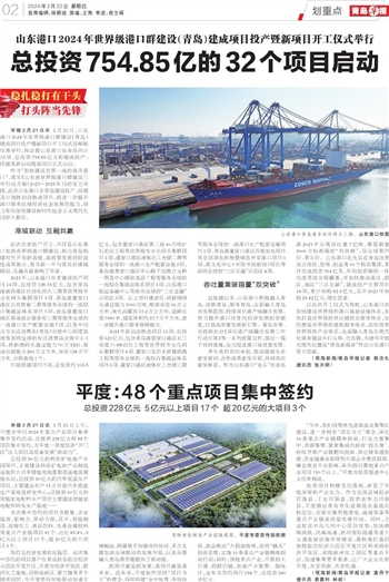 早报2月21日讯 2月21日,山东港口2024年世界级港口群建设(青岛)建成项目投产暨新项目开工仪式在邮轮母港举行,标志着山东港口在青岛共计32项、总投资754.85亿元的建成投产、续建及新启动推进项目正式启动。