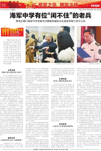 “鏖战工地六载,海天间托起古镇口战略母港;报效国家一生,风云里挥写大珠山豪迈诗篇!”在青岛古镇口海军中学有这么一位老人,每当孩子们上下学时,他总会站在校门口目送,而孩子们经过他身旁时,也总会亲切地喊一声“黄爷爷好”。这位孩子们口中的“黄爷爷”,就是青岛古镇口海军中学党委书记黄毅。