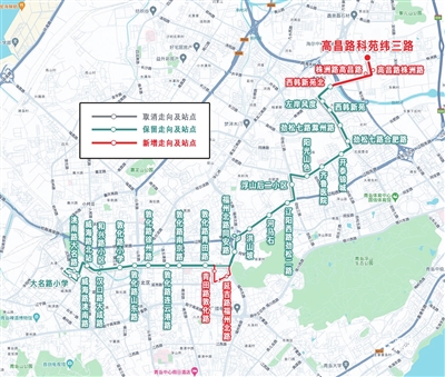 上行:原线路至“西韩新苑北”站,沿株洲路、高昌路,至“高昌路科苑纬三路”站止。