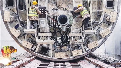 工人安装“龙兴号”TBM构件。青岛地铁供图
