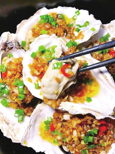 “烤生蚝,蒜蓉是味道的灵魂。”大厨挖一勺热油炸过的蒜蓉平铺在牡蛎肉上,再点缀一两个小米辣圈,淋上酱汁放在炭火上炙烤。待得肉熟上桌,覆盖的蒜蓉保证了牡蛎肉的汁水不会流失,增加了食物的复合味道。连汤带肉吃下去,只感觉人生就此圆满。蒸食,亦是品味生蚝之鲜的一种绝佳方式。上锅摆放生蚝时要记得把凸面朝下,以免汁水流失。蒸制完成后需得整锅端上桌来。拿起一个烫手的蚝,先吸溜壳里的汤,再咀嚼肥美的肉。人间至鲜之味,不过如此吧。