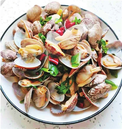 “热锅凉油,姜丝干辣椒炝锅,冒烟后倒入吐净泥沙的蛤蜊翻炒,不需要再添任何调料,盖上锅盖。听到‘噗噗’的声音时,就是蛤蜊在开口。”在市民林建东家,一到春天,就开始吃蛤蜊,这道菜会一直吃到夏天。每逢周末,林建东会买上10块钱的蛤蜊,带上一捆啤酒,这就是最好的晚餐组合。有时辣炒、有时清蒸,肥美的蛤蜊肉晶莹剔透,贝壳里的汤汁汩汩流出。揭开锅盖那一瞬间会有夹杂着海水味道的水汽冲入肺腑。盛盘时再配上一小把香菜,奶白色的原汤承载着蛤蜊的味之精髓,碧绿的香菜与红色的辣椒点缀其间。一盘辣炒蛤蜊上桌,就是海滨人家的家常之味。
