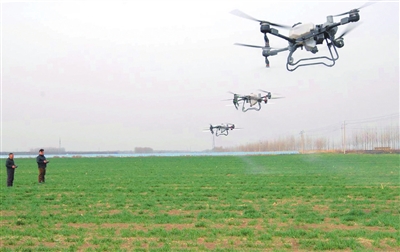 左图:农民利用植保无人机在麦田里进行喷药作业。
