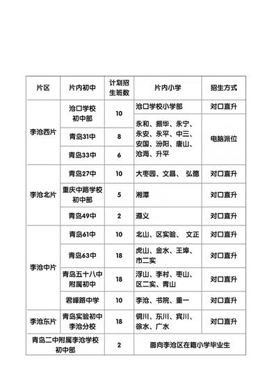 青岛六十三中、青岛五十八中附属初中招生班额均从去年的14个增加到18个。沧口学校初中部、重庆中路学校初中部、青岛实验初中李沧分校招生班额均增加了2个,分别达到10个、5个、18个。青岛二中附属李沧学校小学部仍然采取电脑派位的方式,面向符合李沧区入学条件的适龄儿童招生;初中部面向李沧区在籍小学毕业生招生,其他公办初中继续以学区片为单位,面向片内小学采用对口直升或电脑派位方式招生。