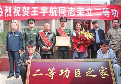 “恭喜!您的儿子在部队表现优异,荣立二等功,这是您全家的荣耀,也是即墨的骄傲。”青岛市即墨区人民武装部的领导热情地向王宇航的父母表示祝贺。来到王宇航家中,军地领导分别为王宇航的家人佩戴荣誉绶带,送上喜报和鲜花,并颁发奖励金。