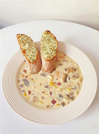 “在我看来,中餐和西餐的汤各有千秋。我喜欢喝莲藕老鸭汤和老北京的酸辣汤,同时也对奶油蘑菇汤醇厚的奶香和蘑菇鲜味的组合十分着迷。”奶油蘑菇汤是美食博主瑶瑶吃西餐的必点菜式。“直到法国朋友把奶油蘑菇汤的独门秘方教给了我,我便开始自己在家练习,手艺越练越精,分分钟秒杀‘米其林’。”