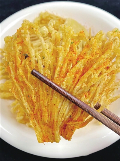 “四时更替,适时而食,不时不食。”在各种食物不分时节地被大量生产制造的今天,天妇罗仍保留着较强的时节特征与季节属性。选择应季、自然生长的食材制作天妇罗,三分技术,七分选料,这保证了天妇罗食材的新鲜度。桃子在漳州路附近经营一家日料小馆,她尽力展现出食材最好的状态,选择最新鲜的时令食材料理。“天妇罗与时节有和谐共生关系,当下最好的选材非菌菇莫属。”相比大虾、秋葵、红薯、苏子叶等,菌菇类天妇罗则丰腴肥美,咬下去会有爆汁的惊喜。尤其是金针菇天妇罗,一撮撮裹着面衣的金针菇在油锅中像花儿一般绽开来,变成一簇簇金色的小花丛,酥脆鲜嫩的口感下,再来一点料汁,便多了丝丝缕缕的清鲜。