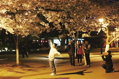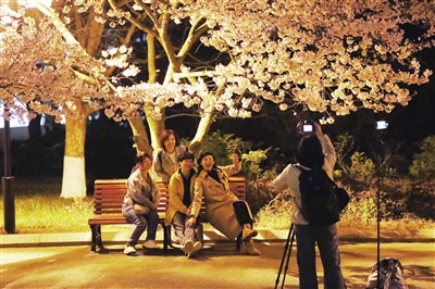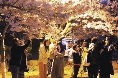 夜樱美景还吸引不少摄影爱好者,他们支起三脚架、架上闪光灯,在夜色中定格樱花的别样风采。紧追城市打卡热点的时尚博主们也纷至沓来,欣赏直播这夜樱盛放的景观。
