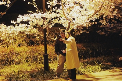 华灯初上,夜幕低垂,朵朵夜樱点缀,在灯光下仿佛雪落枝头,让夜晚的公园多了几分梦幻。穿梭于光影之间,一步一花开,步步樱相随。樱花在灯光的烘托下光影婆娑,几乎每棵树下都有拍照留念的市民。