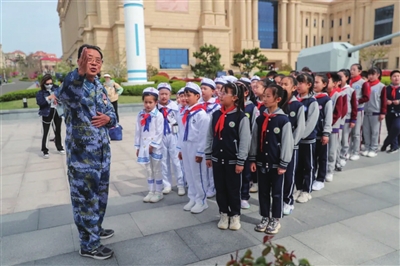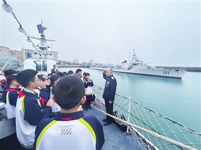 军休干部焦建伟带领学生登上军舰进行“实景式”宣讲。