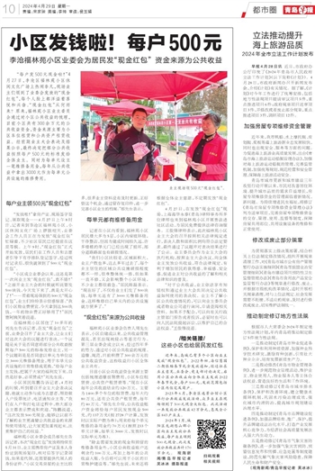 “每户发500元现金啦!”4月27日,李沧区福林苑小区休闲文化广场上热闹非凡,现场业主们领到了业委会发放的“现金红包”,每个人脸上都洋溢着喜悦和兴奋。“现金红包”从何而来?原来,福林苑小区业主委员会通过对小区公共收益的梳理,目前小区共有300余万元的公共收益资金,资金来源主要为小区车位租赁和公共资产租赁收益。经前期业主大会表决及结果公示,最终决定把部分公共收益按照每户500元的标准发给全体业主。同时为每单元设立一笔维修备用金,每年从公共收益中拿出3000元作为每单元公共设施的维修费用。