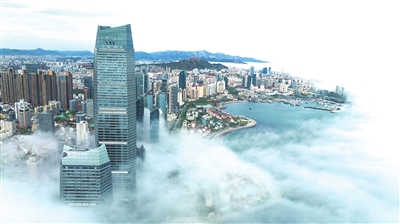 28日下午,青岛沿海一线出现平流雾。城市的高楼大厦在雾中若隐若现,仿佛让人置身云端之上。据悉,岛城的平流雾多出现在春夏季节,其显著特点是层次分明,视觉效果十分震撼。