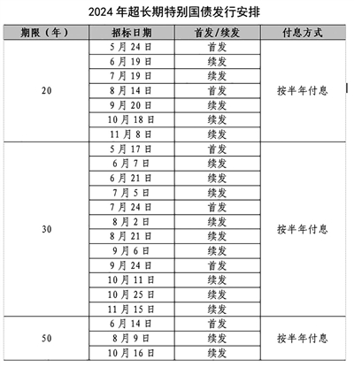 财政部办公厅5月13日发布通知,明确了2024年超长期特别国债发行有关安排。根据发行安排,今年超长期特别国债的发行额度为1万亿元,期限分别为20年期、30年期和50年期。 其中20年期超长特别国债7只,首发2只,续发5只,最早于5月24日发行;30年期超长特别国债12只,首发3只,续发9只,最早于5月17日发行;50年期超长特别国债3只,首发1只,续发2只,最早于6月14日发行;三个品种从5月17日首发到11月中旬发行完毕,都是按半年付息。