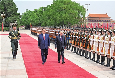 5月16日上午,国家主席习近平在北京人民大会堂同来华进行国事访问的俄罗斯总统普京举行会谈。这是会谈前,习近平在人民大会堂东门外广场为普京举行隆重欢迎仪式。新华社发