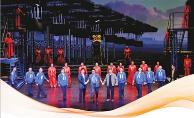 值得一提的是,与首版相比,《弄潮》第七幕《山海碧连天》增加一首“新歌”《山海颂》,歌词凝练,唱腔大气,舞台上张连钢夫妇海边漫步,追忆往昔,面对现代化港口放歌抒怀,“海风吹,海鸥翔,春潮浩荡……我的城,我的港,在我身旁”。这首歌既有京剧的神韵,又有京歌的亲和,获得了专家好评。在一部写实的工业化京剧结尾,用一首歌曲来点题,让观众感受到浪漫的升华。