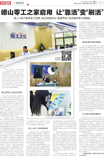 “首先,零工之家是一个信息推介的窗口,在传统线上设摊点、摆岗位的基础上,我们充分运用直播带岗等数字新媒体技术,通过线上线下相结合的方式,及时发布各类用工信息,让企业和求职者能够迅速匹配到合适的岗位和人才。其次,它是技能培训和创业平台,通过多元化的技能培训和创业辅导,帮助求职者提升职业技能,增强就业创业的核心竞争力。此外,我们还设立了劳动维权和生活服务窗口,为务工人员提供法律援助、心理咨询、生活帮助等一系列贴心服务。”崂山区人力资源和社会保障局局长孟兆轲表示,为了更好发挥崂山区零工之家的功能作用,目前形成了“1369”服务体系:“1”是指一个内核,即就业是最大民生;“3”是指三大服务体系,即零工就业服务体系、企业招聘服务体系、零工关爱服务体系;“6”是指六心工作理念,即就业安心、维权用心、服务暖心、群众舒心、用工放心、企业省心;“9”是指九项服务内容,即就业政策宣传、零工招聘服务、劳动维权平台、线上服务平台、就业技能培训、零工社交关怀、用工信息发布、企业招聘路演、直播带岗推广。