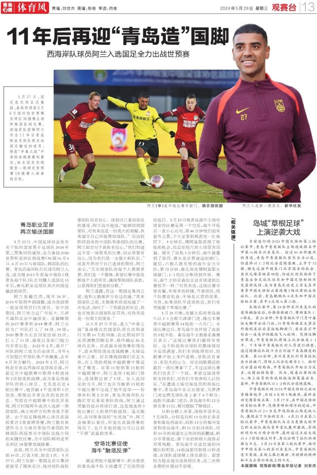 11年后再迎“青岛造”国脚