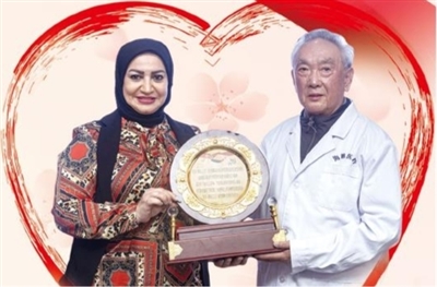 玛奈尔(左)向青岛市海慈中医医疗集团中医专家曲崇昆赠送感谢牌。