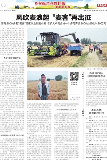 眼下,河南、安徽等地的小麦迎来了丰收季,青岛2000多名“麦客”像往年一样,奔赴这些区域收割小麦。端午节前后,他们将陆续返回青岛,正好赶上本地小麦成熟收割。青岛早报记者从市农业农村局获悉,青岛市农机跨区作业已正式启动,各区市正陆续开展作业活动。今年,全市共发放跨区作业证1200个,预计参加“三夏”小麦机收的联合收割机达2000台,作业面积200多万亩,作业收入1.2亿元以上。青岛“麦客”出征的过程中有哪些酸甜苦辣?5月29日,青岛早报记者千里追访了在安徽阜阳作业的即墨“麦客”巩合峰,听他讲述这些年“南征北战”的收麦故事。