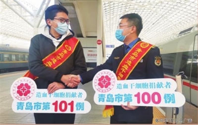 2020年12月4日,青岛市第101例非血缘关系造血干细胞捐献者张同军来到青岛火车站,准备乘坐去济南的列车,开始他的捐献之旅。上车前,他和前一天刚完成捐献的青岛市第100例非血缘关系造血干细胞捐献者马广涛相遇,两人握手互相祝福。第100例的马广涛画下了一个完美的句号,青岛用了16年半时间,由99位捐献者(其中1人两次捐献)完成,在全省率先实现了百例捐献突破;张同军是第101例,一个新的开始,向着200例迈进。当时大家都没想到,从101例到200例,青岛仅用了3年半时间,97位捐献者(其中3人两次捐献)用爱心接力完成,青岛即将成为全省首个实现200例捐献的城市。青岛200例捐献者的数量,在全国同类城市中位于第一梯队,仅次于深圳、广州、杭州。