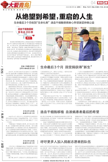 家在胶州的周甄金昨天入院做采集造血干细胞的准备工作,他将成为青岛市第200例捐献造血干细胞志愿者。从1到200例,志愿者的捐献故事在青岛仅仅是一个缩影。在这背后,中国有一组数字牵动着千万人的心。截至2023年,中华骨髓库非血缘造血干细胞捐献突破15000例,无数病人因此重获新生,而目前中华骨髓库登记的志愿捐献者总数据超327万人份。这些数字背后,是几百万献出“生命礼物”的普通人。近日,青岛早报记者深入探访,走近造血干细胞受捐者、相关医学专家,听他们讲述“生命重启”背后的故事。