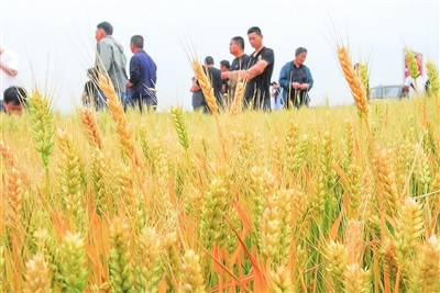 参加测土配方施肥推广技术培训会的种植户在查看小麦长势。
