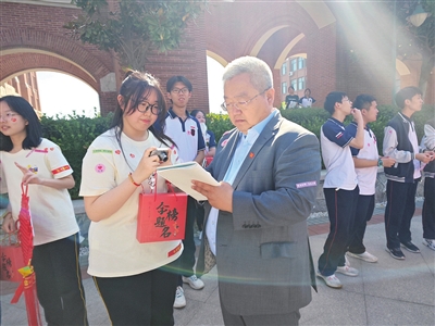 用餐结束后,高三学子们迎着朝阳来到院士广场,学校在这里为他们准备了一面写有老师祝福的心愿墙。高三学子们在这面心愿墙上郑重地写下了自己的名字,留下了自己对未来生活的美好憧憬,也留下了自己对百廿礼贤的无限感激。孙睿校长为高三各班送上象征礼贤院士精神的“得胜牌”,预祝高三学子金榜题名、旗开得胜。随后,高三学子们步入红毯,走过院士路,穿过院士门,班主任与任课老师们亲手赠予每位高三学子特殊的伴手礼盒。记者看到,礼盒上有孙睿校长和全体高三老师的亲笔签名;打开礼盒,有老师为高三学子专门订制的工艺品金榜高“粽”、一举夺“葵”以及“状元糕”。老师们与高三学子拥抱、合影,三年的陪伴化作句句祝福,为他们送去了支持与关爱,坚定了他们全力以赴、高考必胜的信心与决心。
