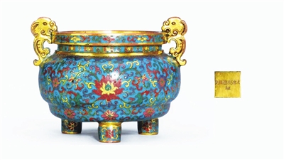 崔芦圣婴表示,“这尊掐丝珐琅宝相花纹龙耳三足炉的尺寸有10.3 厘米,清代追摹古风到乾隆年间达到高峰,当时宫廷常把古代青铜器的造型纹饰运用到珐琅器的制作中,仿古器物与珐琅结合后,就创作出了另一番别样的艺术特色,也开创了珐琅器仿古器型的滥觞,这尊炉正是这一风气下的产物。”记者看到,掐丝珐琅宝相花纹龙耳三足炉以红、黄、绿、深蓝、粉等珐琅釉掐饰缠枝宝相花纹,如同莲花盛开,周围枝叶翻折卷曲,线条流畅,相互穿插交错,有“生生息息”的寓意。底部镶嵌的鎏金长方片,有“大清乾隆年制”“被”字楷书刻款。