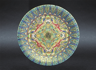 另一件珍品錾胎珐琅福寿纹盘则是鲁迅妻子许广平的祖父许应骙的旧藏。錾胎珐琅福寿纹盘胎体为铜制,采用珐琅彩工艺描绘团寿纹,四周如意云头纹、蝙蝠纹环绕,蝠谐音“福”,並以红色作为主色,以“红”“洪”同音,寓意洪福齐天。外饰花叶纹,纹饰风格繁密,浓郁沉稳。盘底光素,外壁饰缠枝花卉纹。