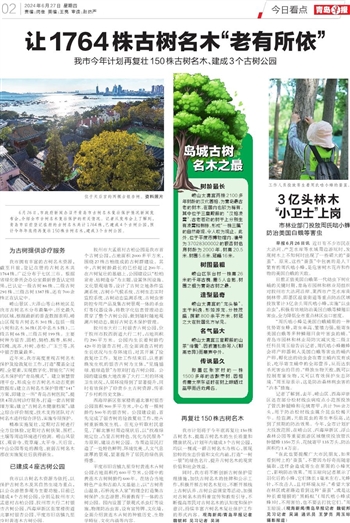 近年来,我市高度重视古树名木保护及抢救复壮工作,打造“覆盖全过程、全要素,实现数字化、智能化”古树名木保护的“青岛模式”。建立智慧管理平台,形成全市古树名木动态更新数据库;建立古树名木保护管理“141”方案,即建立一所“青岛古树医院”,提供4项古树诊疗服务,打造一套古树管理方案;建立“古树名木健康档案”;建立综合评价制度,技术支持团队对古树名木进行综合评估,实施专项保护。