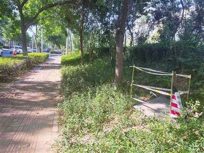 早报记者接到求助电话后,第一时间赶到了位于李沧区宾川路的青岛市第八人民医院东院区。该院区今年才投入使用,附近许多施工围挡尚未拆除,绿化带的植被也较为杂乱。早报记者在该医院西门附近找到了王先生描述的那口深井,该深井周边已经拉起了警戒线,在井口处也使用了木板进行遮盖,但由于该深井位于绿化带中,警戒线起到的警示作用非常有限。