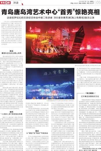 昨晚的秀演吸引了青岛以及国内外众多观众广泛关注,在网络上也引发了现象级话题讨论。话题#海上有青岛 2315万次播放、#海上有青岛首演 3664万次播放、#一路向北去看海1.7亿次播放、#北方的海 2.9亿次播放。中建二局青岛唐岛湾艺术中心项目成为青岛市景点收藏榜第一名,收藏人数1万+。产品《海上有青岛》单人票青岛商品总成交榜第一名。直播间连续多天全国游玩团购榜第一名。这场全景秀演已成为观众打开青岛深厚海洋文化的窗口。