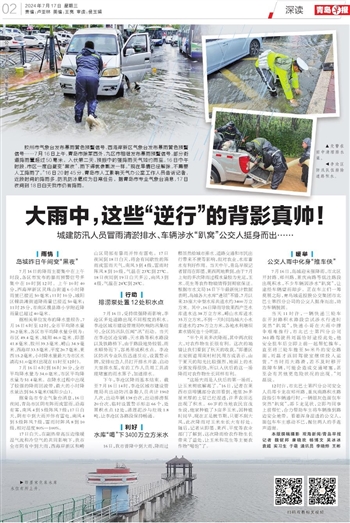 7月16日,受持续强降雨影响,李沧区多处道路出现不同程度的积水。李沧区城市建设管理局吹响防汛集结号,全区防汛队伍闻“汛”而动。当天在李沧区沧安路、天水路等积水路段以及铁路桥下,由于路段地势较低,雨水顺势而下,容易形成积水点。李沧区防汛专业队伍迅速反应,设置警示牌,安排应急人员打开排水井盖、启动大型排水泵,有的工作人员用工具清理堵塞的雨水箅子,加速排水。