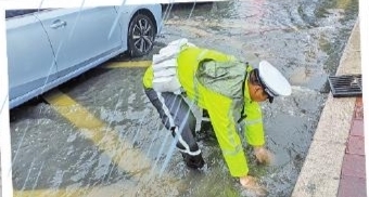 ▲交警在雨中清理排水渠。