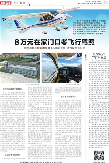 花8万元左右的培训费用,岛城市民就可在家门口考初级飞机驾驶员执照了……通用航空服务领域不断扩大,拉近了普通大众与航空行业的距离,如今,普通市民开飞机已经不再是遥不可及的梦想。昨天,青岛早报记者探访即将正式开航的即墨机场,听航空业内人士揭秘私人飞行驾照的“台前幕后”。