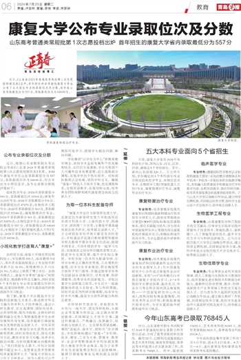 近日,《山东省2024年普通类常规批第1次志愿投档情况表》出炉,首年招生的驻青高校康复大学也公布了五大招生专业的录取位次及分数,其中在山东录取最低分为557分,录取最低位次为64649名。