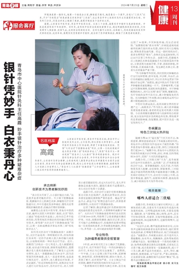 高霞,山东省名中医专家、青岛市中医药名家。从医三十余载,高霞用手中银针为患者除病痛。中医是我国传承千年的国粹。而针灸,是传统中医防治疾病的重要方法,通过刺激机体的某些经络、穴位来调节人体脏腑、经络气血,达到防治疾病的目的。没有仪器可以依托,治病救人,凭的是高超的医术和足够的经验,这些年来,高霞仅仅凭借着妙手银针,就治好了很多疑难杂症,解除了无数患者的痛苦。