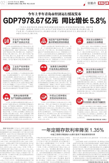 7月25日,青岛市统计局、国家统计局青岛调查队发布2024年上半年青岛市经济运行情况。根据市级生产总值统一核算结果,2024年上半年,全市生产总值7978.67亿元,按不变价格计算,同比增长5.8%。分产业看,第一产业增加值234.92亿元,同比增长4.0%;第二产业增加值2633.41亿元,增长8.6%;第三产业增加值5110.34亿元,增长4.4%。