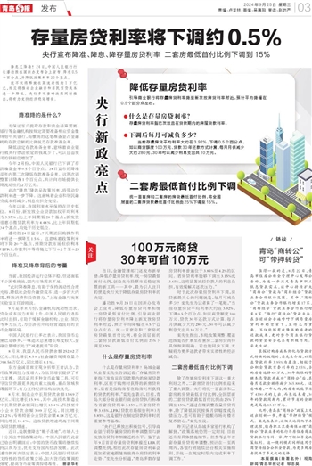 昨天记者从岛城多家银行机构了解到,“政策落地仍需一定时间,目前还未有具体措施细节。但参考去年首套存量房贷利率调整,预计在一至两周内,各银行将陆续出台相关实施细则,并统一在规定时限内完成利率下调工作。”