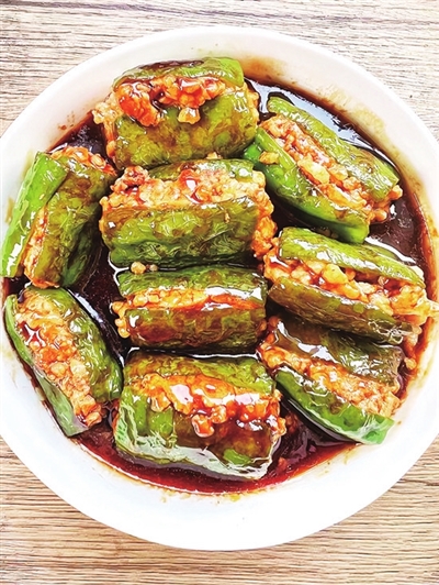 酿青椒是所有酿菜中颇家常,却让人垂涎欲滴的一道。当肉馅在辣椒中“躺平”,辣中带着肉香,一口送入嘴中,一口一个停不下来。选用色泽浅绿、外形饱满、有光泽、个头稍大的青椒。将青椒用五花肉碎酿好后,先清蒸至八成熟,再经油煎至金黄起斑。这样做出来的酿青椒,不容易外焦里生,而且吃起来鲜美多汁,肉馅因为包裹在青椒里面完全入了味,浸透了青椒的微辣,配口米饭就停不下来。