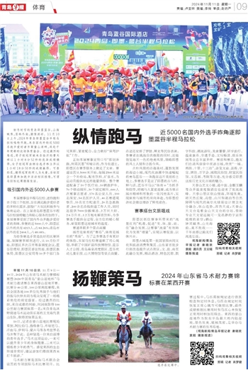 早报11月10日讯 11月9日—10日,2024年山东省马术耐力赛锦标赛暨2024中国青岛“姜山湿地杯”马术耐力邀请赛在莱西姜山湿地开赛。比赛分40公里、100公里两组赛程,来自全国各地100多位优秀骑手与他们的骏马伙伴共同为观众呈现了一场精彩绝伦的视觉盛宴。经过激烈的比拼,来自成都的何毅、何润庚取得100公里耐力赛团体第一名;来自青岛沐野骑迹马术运动俱乐部的王文海代表山东队,取得团体第五名。