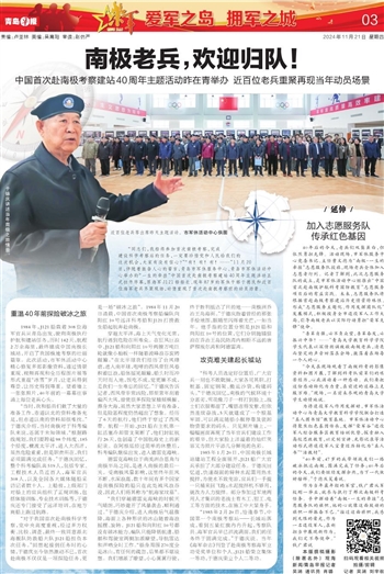 40年后的今天,老兵们双鬓虽白,但依然勇担先锋。活动现场,市军休服务中心党委书记、主任曹文德为“南极·一生的牵挂”志愿服务队授旗,现场老兵全体加入志愿者行列。记者了解到,此次志愿服务队的成立,是市军休活动中心继推出“中国首次赴南极护航科考国防教育”志愿服务项目后的有益实践。未来,志愿服务队将根据首赴南极考察建站历史情景特殊性,形成“志愿服务主题化、作用发挥团队化”发展模式,积极投身全市退役军人工作大局,引导南极老兵以实际行动勇担“荣军先锋”使命。