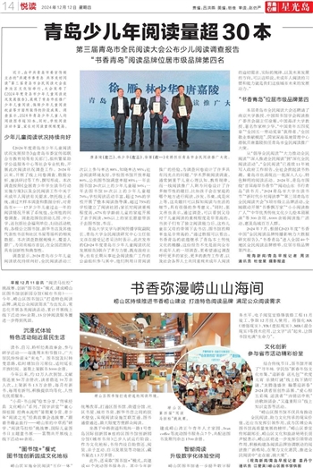 从“倡导全民阅读”“大力推动全民阅读”“深入推进全民阅读”到“深化全民阅读活动”,“全民阅读”已连续11年被写入政府工作报告,全社会掀起读书热潮。青岛市也涌现出一批深入人心、特色鲜明的阅读活动。2024年,青岛市围绕“首届海岸书香节”“阅动山东 书行青岛”读书月、“2024青岛市大学生读书节”“新时代乡村阅读季”“第三届青岛市全民阅读大会”5项市级主品牌活动,全城联动开展“书香飘万家”“小小阅读推广人”“中华优秀传统文化少儿绘本剧展演”等300余项、6000余场阅读推广活动,惠及岛城百万人群。
