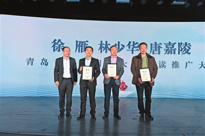唐嘉陵(左二)、林少华(左三)、徐雁(右一)受聘担任青岛市全民阅读推广大使。