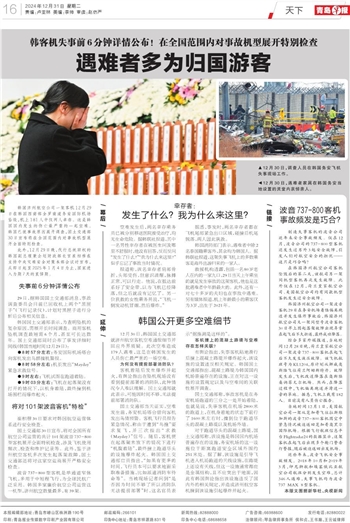 韩国济州航空公司一架客机12月29日在韩国西南部全罗南道务安国际机场坠毁,机上181人中仅两人幸存。这是韩国国内发生的伤亡最严重的一起空难。韩国已就事故原因展开调查,国土交通部30日宣布将在全国范围内对事故机型展开全面特别检查。
