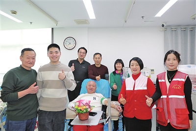 “巧克力大爷”陈爱国(前排左三)和马仁山(后排左二)等人为阳阳撸袖献血。