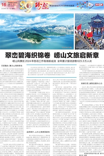 以山海为诗,拥天地入怀。铿锵锐进的崂山,正以蓬勃向上的姿态,奋力书写文旅事业高质量发展的时代新篇——2024年,崂山风景区紧紧围绕“提质争先年”部署要求,着力提效提质,奋力竞进争先,推动各项工作取得新成效,全年累计接待游客623.3万人次,入选全国首批“避暑消夏好去处”名录,景区“1355”融合治理体系入选文旅部“文化和旅游深度融合发展地方范例”。