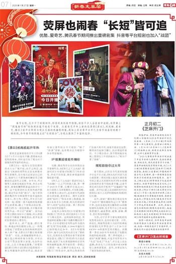 春节期间,以抖音为代表的短剧平台也不甘示弱,《阳光灿烂时》《天涯小娘惹第二季》《河豚小姐》《夫妻的春节》《以爱之名》《朝阳初升》等30部精品短剧将在春节档轮番开播,让春节里走亲访友的手机用户“见缝插针”地追剧。其中《以爱之名》《朝阳初升》分别是《以家人之名》和《隐秘的角落》的衍生剧。