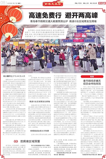 记者从青岛交警支队获悉,2025年1月28日(除夕)至2月4日(正月初七)为春节假期(2月5日正月初八正常上班),共8天。在此期间,收费公路(含收费桥梁和隧道)免收7座以下(含7座)载客车辆通行费。据气象部门预测,我市节前将出现一轮自西向东的降温降水天气,对节前出行将产生不利影响,春节假期天气以多云为主,无大范围恶劣天气。