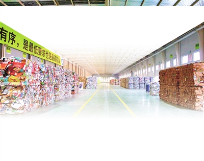 “爱回收·爱分类”可回收物分拣中心内,经过分拣压缩的废品。